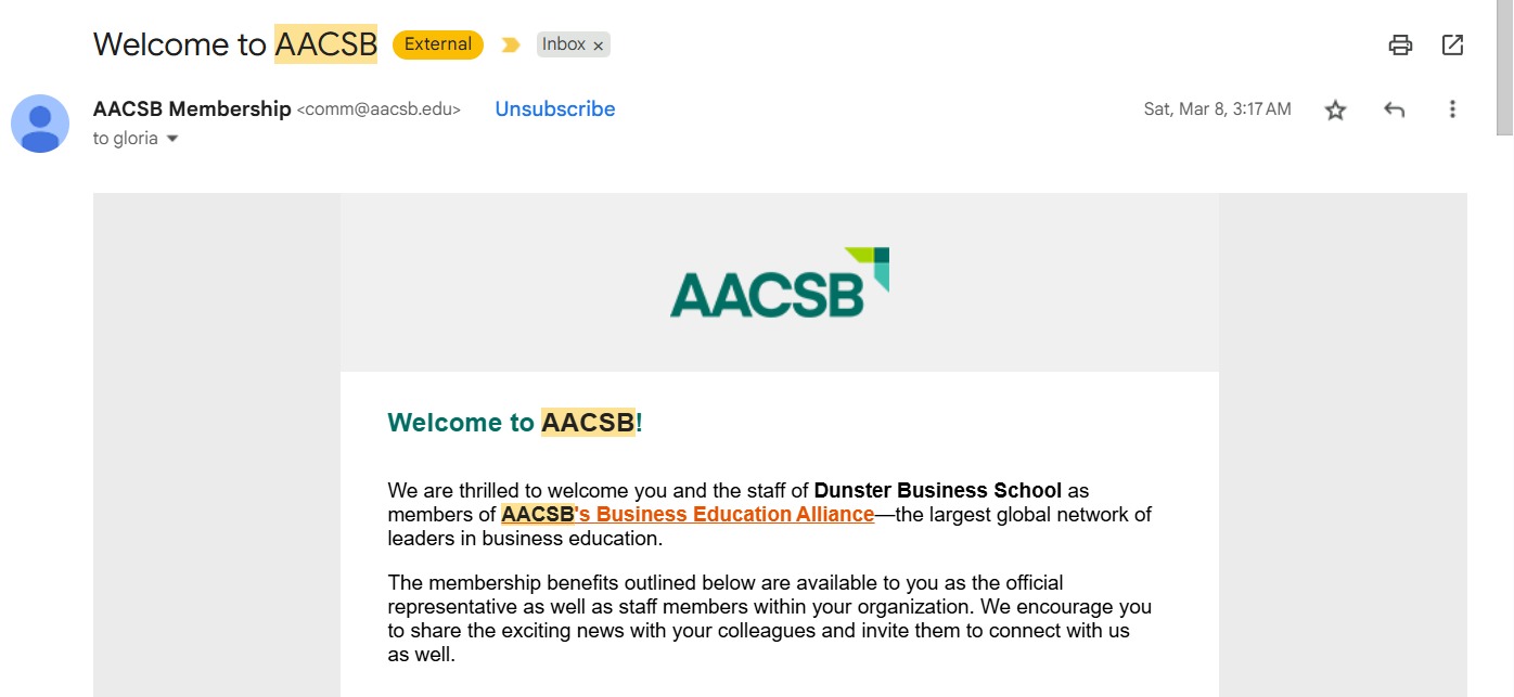 Dunster Business School is a proud candidate for accreditation of Association to Advance Collegiate Schools of Business (AACSB). AACSB (Association to... Advance Collegiate Schools of Business) is a prestigious global accreditation body for business schools.It sets high standards for business education, ensuring institutions provide quality academic programs, impactful research, and strong faculty qualifications. AACSB accreditation is recognized worldwide and is often a mark of excellence for business schools, enhancing their reputation and credibility.
