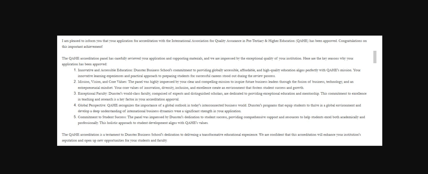 This accreditation underscores the institution's commitment to delivering high-quality business and management education. Meeting QAHE's rigorous standards, Dunster Business School has demonstrated its dedication to providing transformative educational experiences and maintaining high academic quality.